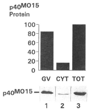 Figure 4. Biochemical localization of p40MOlS in stage VI oocytes. Proteins from five dissected stage VI oocyte GVs (lane 1), five dissected stage VI oocyte cytoplasms (lane 2), and five total stage VI oocytes (lane 3) were separated by SDS-PAGE and analyzed by Western blotting using M015-specific immune serum and ECL detection (bottom). The relative amounts of p40Mol` present were quantitated by densitometry and plotted using an arbitrary scale OF 1-100 |
