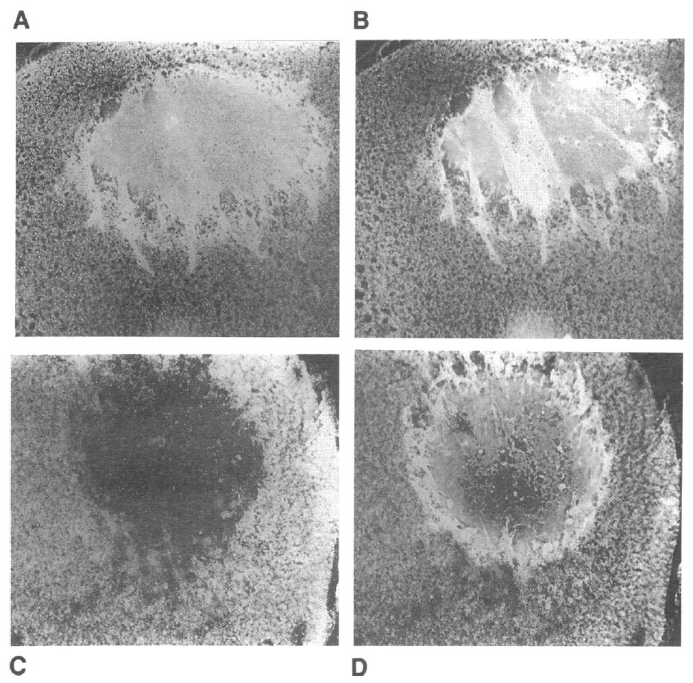 Figure 5. Indirect immunofluorescent localization of p4O-MO15 in stage VI oocytes. Acetone-fixed cryosections of stage VI oocytes were incubated with either M015-specific rabbit polyclonal antibody, together with a mouse monoclonal antibody to nucleoplasmin ( A and B) preimmune rabbit serum together with a mouse monoclonal antibody to nucleoplasmin (C and D). Rabbit antibodies were detected using alkaline phosphatase conjugated goat. antirabbit IgG, followed by incubation with Fast Red substrate and fluorescence viewed using a Rhodamine filter (A and C). Mouse antibodies were detected using FITC-conjugated goat antimouse IgG and fluorescence viewed using a fluorescein filter (B and D). |