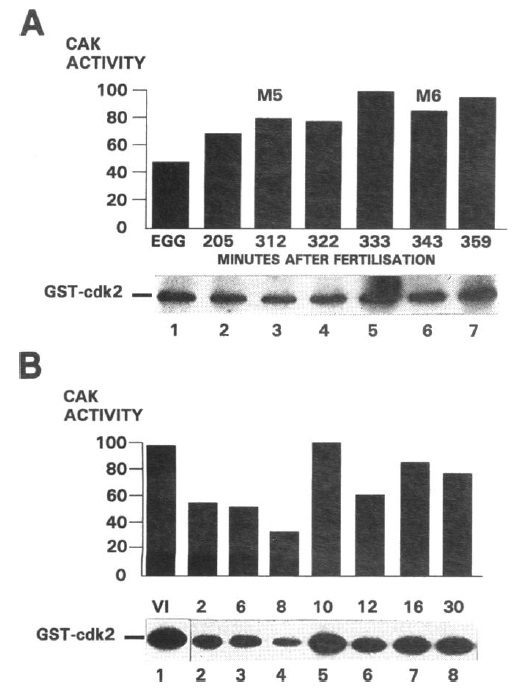 Figure 7. The activity of p4OMOI5 during early embryogenesis. (A) p40MlS immunoprecipitates were prepared from five unfertilized eggs (lane 1) and five cleaving embryos at 205 (lane 2), 312 (lane 3), 322 (lane 4), 333 (lane 5), 343 (lane 6), and 359 min (lane 7) after fertilization and were incubated with 1 ,g of GSTcdk2 and [_-32P]ATP for 45 min at 23°C. Supematants were recovered, and phosphorylated GSTcdk2 protein was analyzed by SDS-PAGE and autoradiography (bottom). The relative amounts of 32P associated with GSTcdk2 in each reaction were subsequently quantitated by phosphorimage analysis and plotted on an arbitrary scale of 1-100. Mitosis 5 (M5) occurred after 312 min, and mitosis 6 (M6) occurred after 343 min. (B) p40MOI immunoprecipitates were prepared from five mature stage VI oocytes (lane 1) and five stage 2, 6, 8, 10, 12, 16, and 30 embryos (lanes 2- 8), then assayed for CAK activity as described in A. |