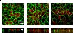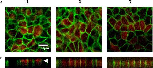 Cellular localization of NCC in the established cell lines. Localization of stably expressed NCC in MDCK II cells expressing NCC only: (1) or co-expressing NCC and wild-type WNK4 (2) or mutant WNK4 (3). XY (A) and XZ (B) images were obtained by confocal laser scanning microscopy. Immunocytochemistry was performed with rat anti-HA mAb (9Y10) and mouse anti-β catenin mAb as primary antibodies, and anti-rat IgG Alexa 546 (red) and anti-mouse IgG Alexa 488 (green) as the secondary antibodies. The arrowhead indicates the apical cell surface.