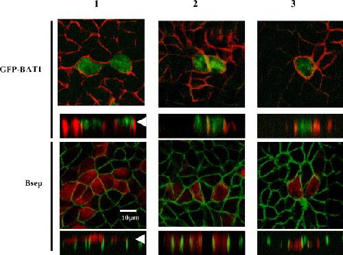 Localization of GFP-BAT1 and Bsep transiently expressed in MDCK II cells. Immunofluorescence of green fluorescent protein (GFP)-tagged BAT1 (upper panels) and Bsep (lower panels) in host cells (1) and MDCK II cells expressing wild-type WNK4 (2) or mutant WNK4 (3). BAT1 is shown in green and β-catenin is shown in red (upper panels). Bsep is shown in red and β-catenin is shown in green (lower panels). Arrowheads indicate the apical cell surface.