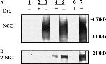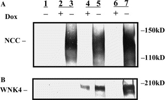 Generation of MDCK II cell lines that express NCC alone or co-express NCC and wild-type or mutant (D564A) WNK4. (A) HA-tagged NCC proteins and (B) Flag-tagged WNK4 proteins were fractioned by SDS–PAGE and detected by using an anti-HA mAb (9Y10) and mouse M2 anti-Flag mAb, respectively. Expression of NCC and WNK4 protein was induced by removal of doxycycline (Dox) from the medium for 4 days. 1, host cell; 2 and 3, cell line expressing NCC only; 4 and 5, cell line co-expressing NCC and wild-type WNK4; and 6 and 7, cell line co-expressing NCC and mutant WNK4.