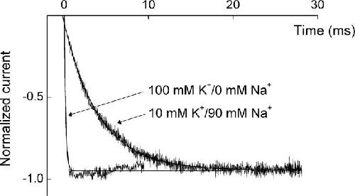 Figure 5. . Extracellular K+ sensitivity of hyperpolarization-induced unblock kinetics in the presence of bis-QAC10. Normalized current transients elicited by stepping membrane voltage from 100 to â70 mV in the presence of 0.1 mM bis-QAC10 and either 100 or 10 mM extracellular K+, where the first 0.1 or 0.3 ms of the record was omitted. The 10 mM K+ extracellular solution contained 90 mM Na+; the intracellular solution contained 100 mM K+ in both cases. The curves superimposed on the current transients are single-exponential fits. From these and similar fits, we obtained time constants of 0.15 ± 0.02 and 4.59 ± 0.27 ms (mean ± SEM; n = 3 and 4) for 100 and 10 mM extracellular K+, respectively.