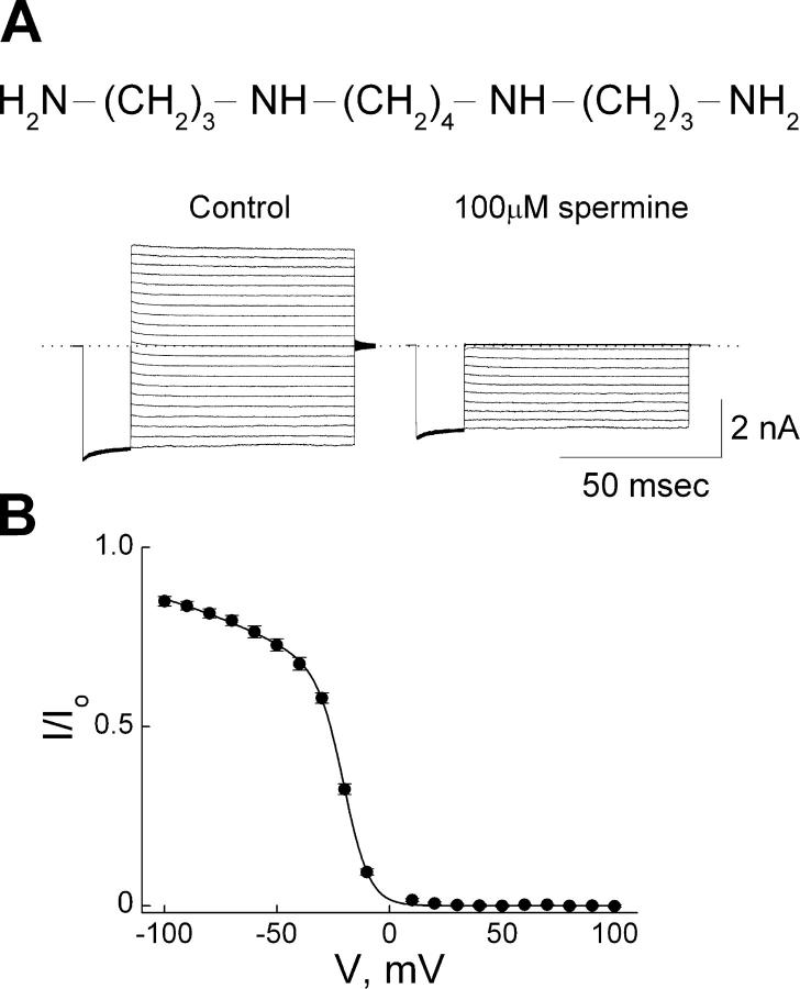 Figure 6. . Voltage dependence of steady-state IRK1 block by spermine. (A) Chemical structure of spermine is shown on top. IRK1 currents recorded from a single patch in the absence (control) then presence of 100 μM spermine were elicited with the same voltage protocol as in Fig. 1. Dotted line indicates zero current. (B) The fraction of current (mean ± SEM, n = 9) not blocked by 100 μM spermine is plotted against membrane voltage. The curve through the data is a fit of Eq. 1, yielding K1 = 1.30 ± 0.06 × 10−4 M (mean ± SEM, n = 9), K2 = 1.44 ± 0.13 × 10−2, Z1 = 0.40 ± 0.02, and Z2 = 4.23 ± 0.13, where the overall appKd (0 mV) = K1K2.