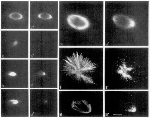 FIG. 4. Fertilized eggs double stained with anti-tubulin (a-f) and anti-Eg5 tail (a'-f') antibodies (affinity purified in all but d'). Sections of