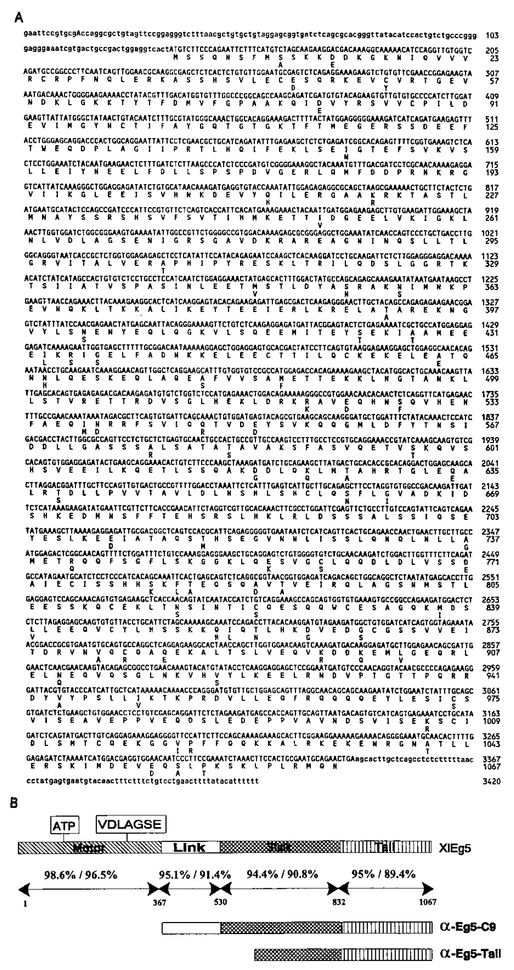 FIG. 1. (A) Nucleotide and predicted amino acid sequence of the second Eg5 eDNA (XLEg5K2), aligned with that of XLEg5Kl. Conserved