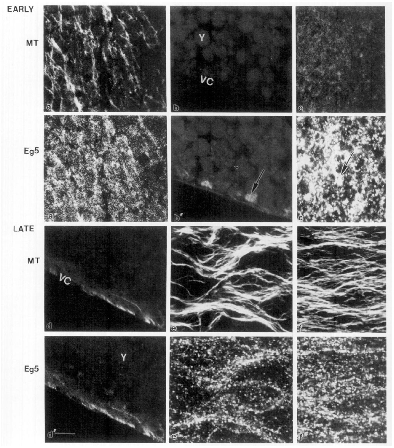 whole eggs (c). In eggs fixed during the second half of the cell cycle (0.65-0.70 NT) a dense microtubule array with associated Eg5 staining can be