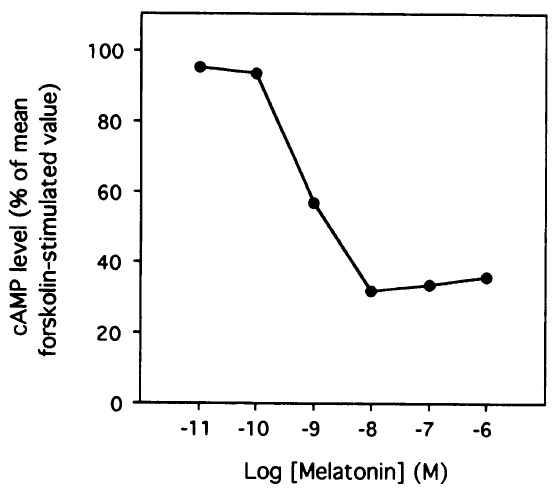 FIG. 3. Melatonin inhibition of forskolin-stimulated cAMP accumulation