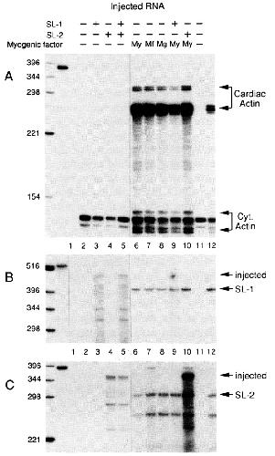 SL1 (B), and SL2 (C) transcripts. (Lane 1) 10 ~g of tRNA (control);