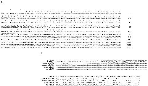 addition sequence (bold). (B) Comparison of XMLC2 and other vertebrate MLC2 proteins. The XMLC2 polypeptide sequence is aligned with the human atrial (Hailstones et al.
