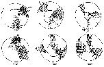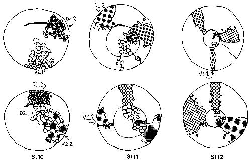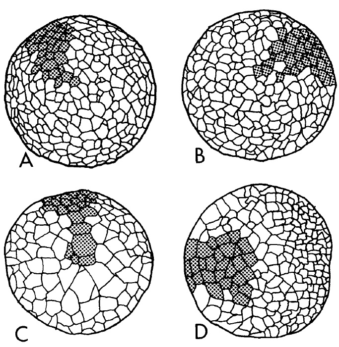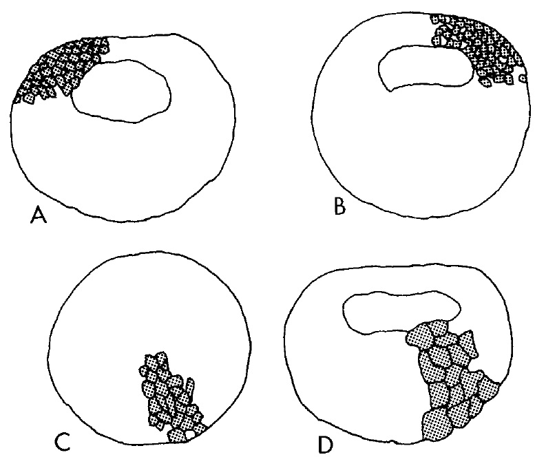 Fig. 16. Camera-lucida drawings of the positions of 16-cell clones in the vegetal hemisphere during gastrulation. In the top row clones of D2.2,