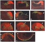 Fig. 11. At stage 10, the B1 clone (red) occupies the dorsal blastopore lip to the site of invagination (arrow). The C1 clone (green) stretches