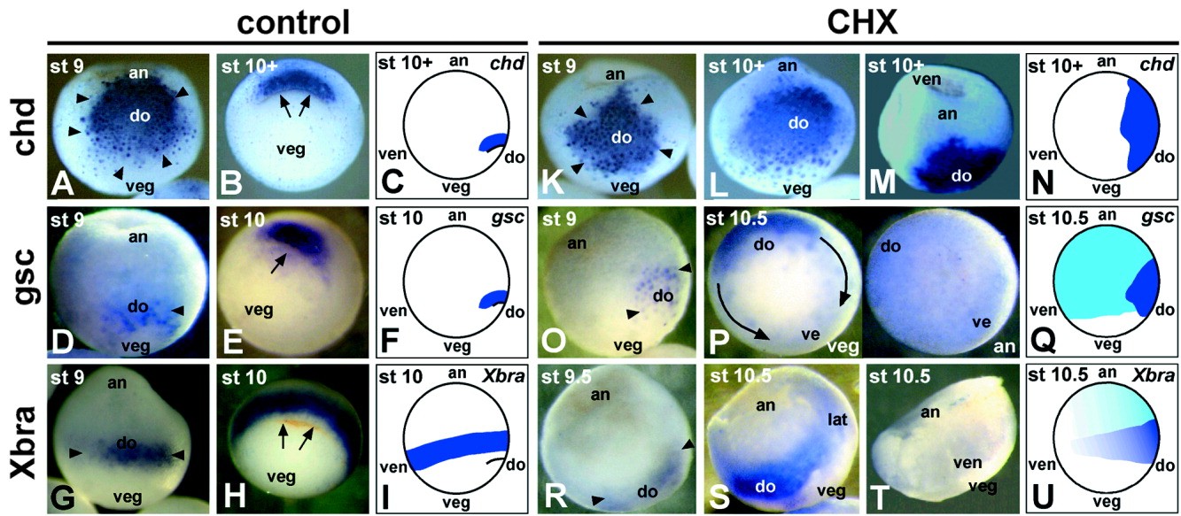is detected in the dorsal vegetalâmarginal region (D) and later in the organizer (E). G,H: Xbra transcripts also appear ï¬rst in the dorsal marginal zone (G) and later mark the mesodermal ring (H). C,F,I: These early gastrula patterns are schematically illustrated in C,F, and I, respectively (lateral views). K,O,R: In CHX-treated embryos, the early chd, gsc, and Xbra expression domains are similar to the control. L,M: At stage 10 , however, the chd pattern resembles an slightly expanded stage 9 pattern. L: Note for example the chd-positive vegetal cells. M: The lateralâventral regions of the animal