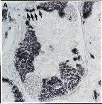 phase-contrast micrograph of a transverse section of a male, stage 54 tadpole. Only the gonadal region is shown. An arrow indicates a