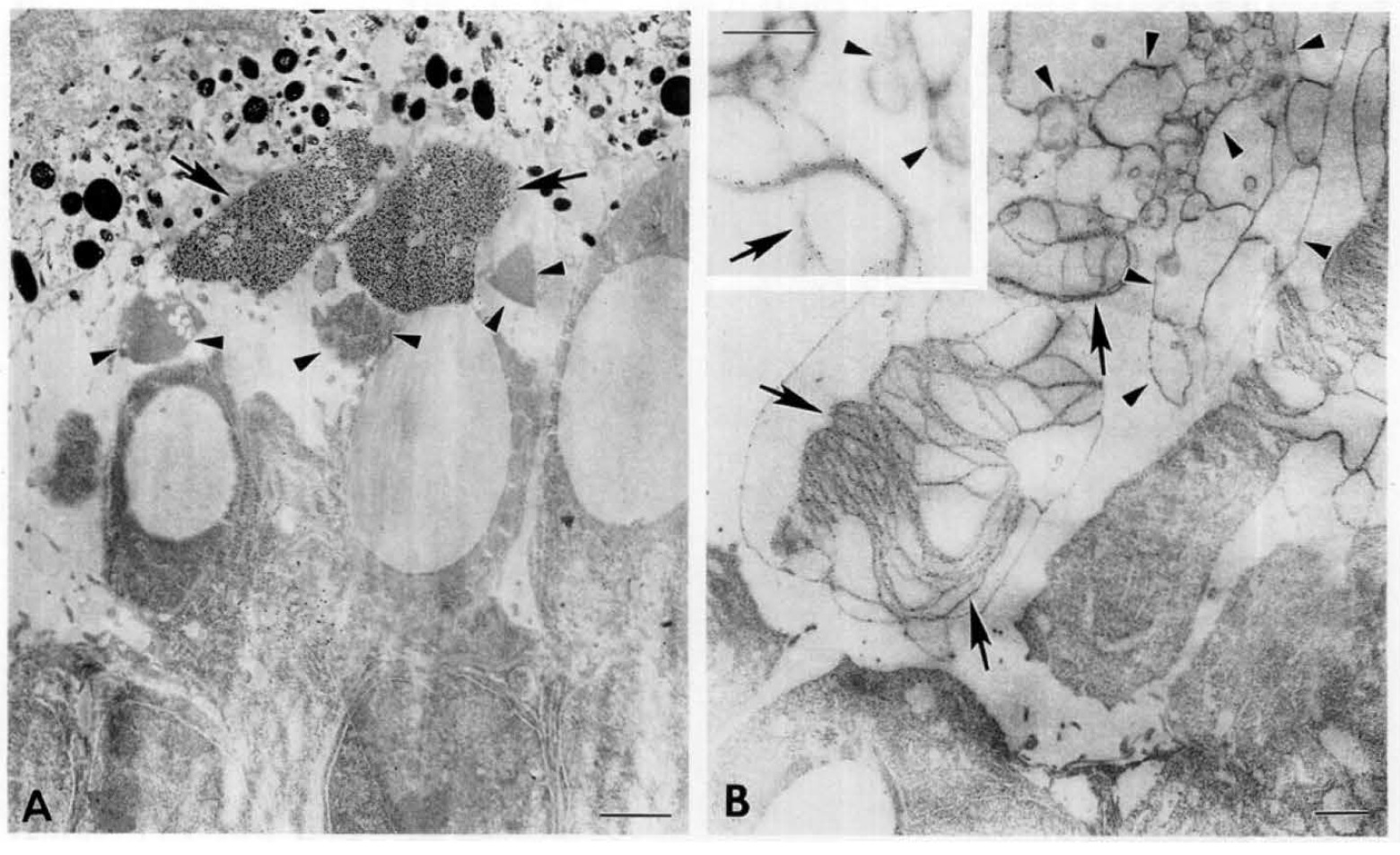 PE. Most outer segments are immunolabeled (arrows). However, some membranous material is unlabeled (arrowheads) indicating that it could
