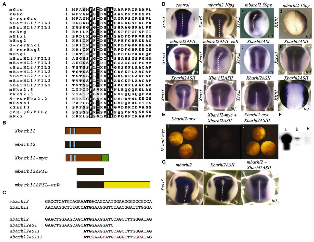 Fig. 2. Changes in Barhl2 levels alter neural plate formation. (A) Sequence comparison between the Eh1 motifs of Gsc, Eng, Nkx, Anf-1, Hesx1 and Msx, and the FILs domains of Barhl proteins. Black shading indicates identical residues, gray shading indicates similarity. Most of the sequences, except for Barhl members, come from Smith and Jaynes (Smith and Jaynes, 1996). (B) Map of the RNA constructs. The two blue boxes indicate the FIL domains; the green box indicates the Myc epitope; the yellow box indicates the Engrailed repression domain. (C) Sequences of the Xbarhl2 antisense morpholinos. The five mispairs in Xbarhl2ASIII are in red and the ATG is in bold. For comparison, the N-terminal sequences of mouse Barhl2, Xbarhl1 and Xbarhl2 are shown. (D) In situ hybridization of embryos injected with mouse Barhl2, Barhl2δFIL, Barhl2δFIL-enR, Xbarhl2ASI, Xbarhl2ASII, Xbarhl2ASIII and analyzed at stage 15. Dorsal view, anterior end upwards. The broken line indicates the midline and `inj' indicates the injected side. Embryos labeled with Xsox3 as probe: (a) control; injected with mouse Barhl2 at (b) 10 pg and (c) 50 pg; (e) injected with mouse Barhl2δFIL (100 pg); (f) injected with mouse Barhl2δFIL-enR (50 pg); (g) injected with Xbarhl2ASI; (h) injected with Xbarhl2ASII; injected with Xbarhl2ASII at (i) 20 ng, (j) 50 ng and (k) 100 ng. Embryos labeled with XK81 as a probe: injected with mouse Barhl2 at 10 pg (d); injected with Xbarhl2ASII (l). (E) Two-cell embryos were injected in one blastomere and analyzed at stage 9. Representative embryos are shown under fluorescent light. (a) Embryos injected with Xbarhl2-myc (100 pg); (b) injected with Xbarhl2-myc (100 pg) together with Xbarhl2ASII (100 ng); (c) injected with Xbarhl2-myc (100 pg) together with Xbarhl2ASIII (100 ng). (F) Western analysis on protein extracts from stage 9 embryos injected with Xbarhl2-myc (100 pg) together with: Xbarhl2ASIII (100 ng) (a); Xbarhl2ASII (50 ng) (b) or Xbarhl2ASII (100 ng) (bâ²) using anti-Myc antibody. (G) Embryos labeled with Xsox3 as probe. The percentage of embryos exhibiting the staining patterns: (a) injected with mouse Barhl2 (10 pg), 78%; (b) injected with Xbarhl2ASII (50 ng), 88%; (c) injected with mouse Barhl2 (10 pg) together with Xbarhl2ASII (50 ng), 60%. |
