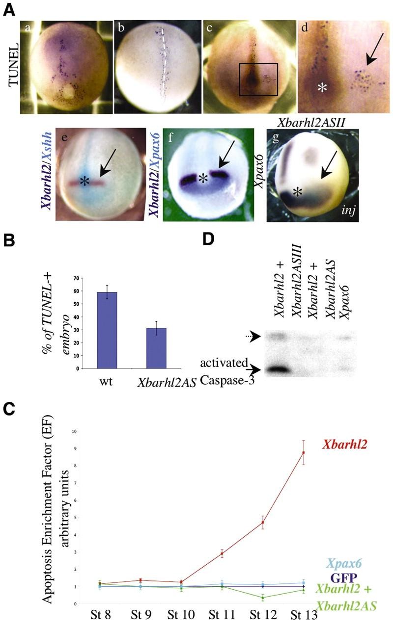 Fig. 4. Barhl2 pro-apoptotic activity is normally involved in regulating endogenous apoptosis. (A) TUNEL staining of stage 12.5 (a), stage 15 (b) and stage 18 (c,d) embryos. (d) Magnified view of the boxed region in c. (e,f) Double in situ hybridization of stage 18 embryos using digoxigenin- and fluorescein-labeled RNA probes: Xbarhl2 (dark blue) and Xshh (light blue) (e); Xbarhl2 (dark blue) and Xpax6 (light blue) (f). (g) In situ hybridization of Xbarhl2AS-injected embryo using Xpax6 as a probe. (a,b) Dorsal views, anterior upwards. (c-f) Anterior views, dorsal upwards. (B) Comparison of the percentage of TUNEL-positive embryos (defined as exhibiting more then 30 apoptotic nuclei in the axial midline, i.e. where endogenous apoptosis normally occurs) between wild-type embryos and embryos injected in the two dorsal blastomeres at the two-cell stage with Xbarhl2AS. Each experimental batch (n=60) was assessed independently. Three different experiments were performed and the results are shown as mean±s.e.m. (C) Kinetics of Xbarhl2 induced apoptosis between stage 8 and stage 13. Embryos were injected in one dorsal blastomere at the two-cell stage with GFP (dark blue), Xbarhl2 (red), Xbarhl2 together with Xbarhl2AS (green) or Xpax6 (light blue) and collected at indicated developmental stages. Cell death was measured by cell death detection ELISA. The apoptotic EF is calculated using GFP-injected embryos as a control. We carried out three different experiments and the results are shown as mean±s.e.m. (D) Western blot analysis on 3 μg of protein extracted from stage 12 embryos injected with Xbarhl2 (100 pg) together with Xbarhl2ASIII or Xbarhl2 (100 pg) together with Xbarhl2ASII, Xpax6 (100 pg), as indicated. The arrow indicates the large (19 kDa) cleaved caspase 3 fragment. The broken arrow shows a nonspecific band used as an internal control. |