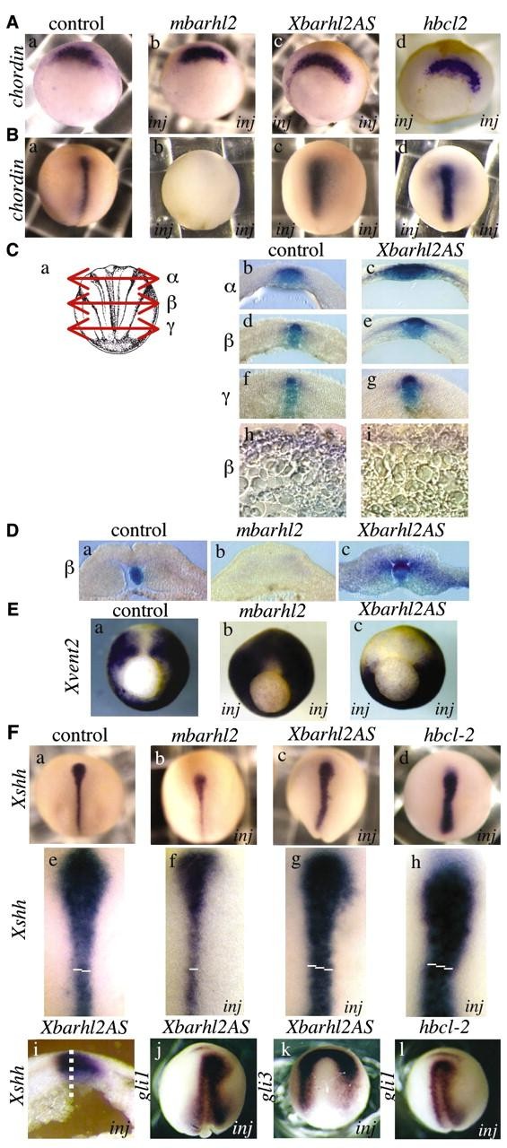 Fig. 5. Manipulation of Barhl2 levels changes the number of chordin- and Xshh-expressing cells. In situ hybridization of embryos injected in either two (A-E) or one (F) dorsal blastomere with mouse Barhl2, Xbarhl2AS or human BCL2. Embryos are shown at (A) stage 10, (B,C) stage 15, (D) stage 18, (E) stage 12, (F) stage 15. (A-D) In situ hybridization using chordin as a probe. (A,B) control (a), mouse Barhl2 (b), Xbarhl2AS (c), human BCL2 (d). (C) Serial sections. (a) Scheme of a stage 14 embryo showing position of cuts. (b-i) Sections of Xbarhl2AS-injected embryo. α level: (b) control; (c) Xbarhl2AS. β level: (d) control; (e) Xbarhl2AS. γ level: (f) control; (g) Xbarhl2AS. Thinβ level sections in the prospective notochord area: (h) control; (i) Xbarhl2AS. (D) β level sections of stage 18 embryos: (a) control; (b) mouse Barhl2; (c) Xbarhl2AS. (E) In situ hybridization using Xvent2 as a probe: (a) control; (b) mouse Barhl2; (c) Xbarhl2AS. (F) In situ hybridization using Xshh as a probe (a-i). (a) Control; (b) mouse Barhl2; (c) Xbarhl2AS; (d) human BCL2. (e-h) Magnified views of a-d, respectively. (g) β level section of Xbarhl2AS-injected embryo. (h,l) In situ hybridization using gli1 as a probe. (i) In situ hybridization using gli3 as a probe. The line in e-h is shown as a scale indicator. |