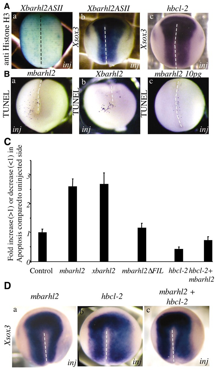 Fig. 3. Barhl2 induces apoptosis in Xenopus neuroectoderm. (A) Stage 15 embryos. (a) Embryo injected with Xbarhl2AS and immunostained using anti-phospho-histone H3 antibody. (b,c) In situ hybridization using Xsox3 as a probe on embryos injected with: (b) Xbarhl2AS and treated with HU; (c) human BCL2 (500 pg). (B) TUNEL staining of stage 15 embryos representative of those injected with mouse Barhl2 (20 pg) (a), Xbarhl2 (20 pg) (b) and mouse Barhl2 (10 pg) (c). (a,b) Anterior views, dorsal upwards; (c) dorsal view, anterior upwards. (C) Number of TUNEL+ cells were counted on the injected side and compared to the number on the control side at stage 15. The results were assessed by Student's t-test. Results are shown as mean.e.m. Injection of mouse Barhl2 increased apoptosis 2.6 times (10 pg to 25 pg) (n=70, P=3.10), as does Xbarhl2 (20 pg, n=20, P=9.10). Injection of human BCL2 (500 pg) reduced apoptosis (n=35, P=0.002), and the effect of Barhl2 (10 pg) was reversed by co-injection of human BCL2 (500 pg) (n=40, P>0.01). Injection of mouse Barhl2δFIL had no effect (n=28, P>0.01). (D) In situ hybridization using Xsox3 as a probe of stage 14 embryos injected with: (a) mouse Barhl2 (10 pg), 82%; (b) human BCL2 (500 pg) 89%; and (c) mouse Barhl2 (10 pg) and human BCL2 (500 pg), 60%. |
