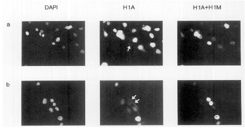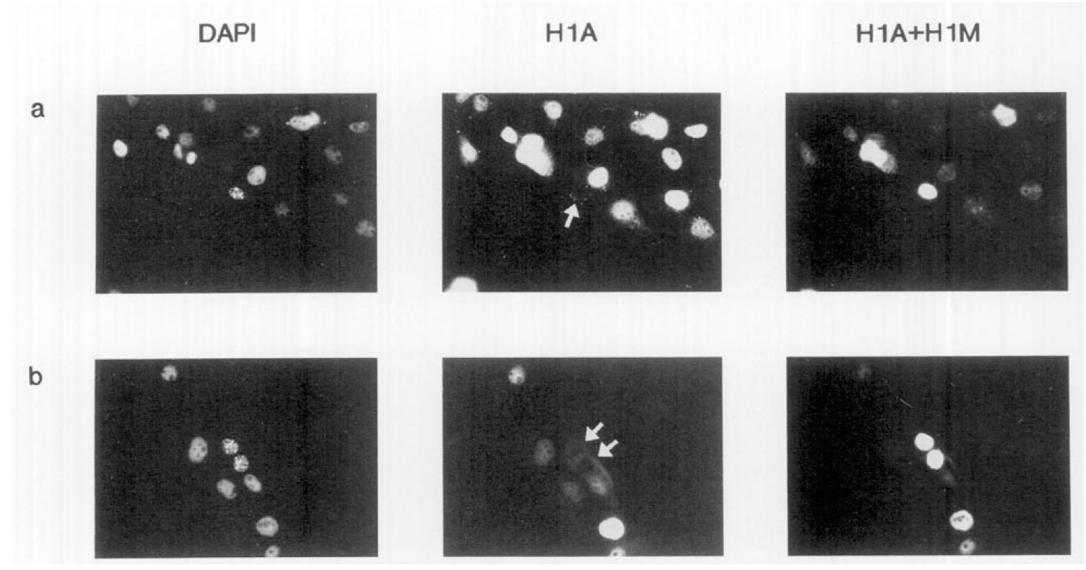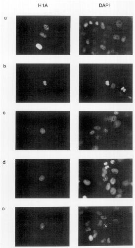 either FITC (HlA) or DAPI fluorescence. Photographic exposure was adjusted such that only transfected cells overexpressing histone HlA