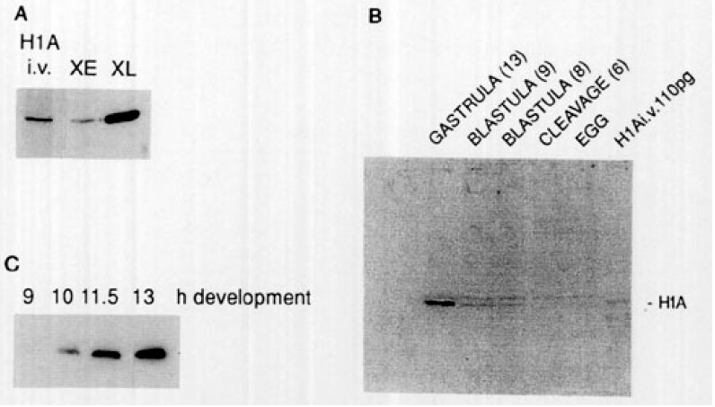 FIG. 3. Western blot analysis of Xenopus H IM protein. (A) HIM levels dur ing oogenesis and early development. Total protein extract of three