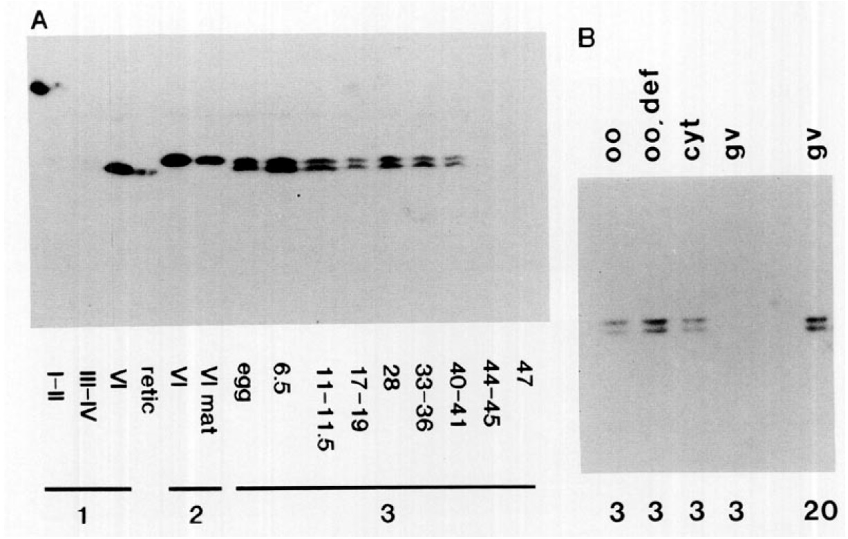 embryonic stages (arabic numerals) are according to Nicuwkoop and Faber (I967). VI mat, -in 11itmmatured oocytes; egg, unfertilized eggs; retic,