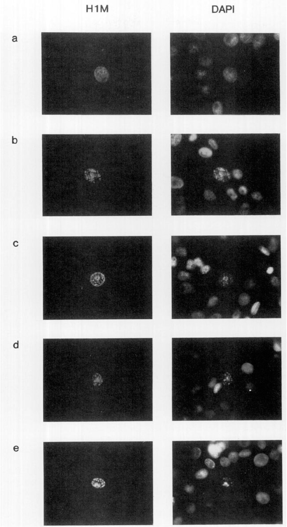FITC-coojugated secondary antibody. (a) Cell in interphase; (b) cell in mitosis; (c-e) different examples or HlM-positive cells exhibiting