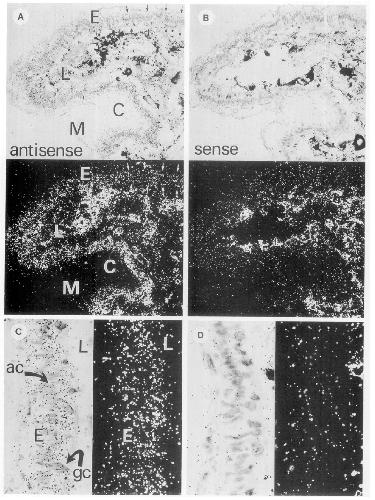 between small arrows) to that produ~d on contrcl serial sections (B) hybridited with a radiolabcled sense cRNA. (C and D) At higher