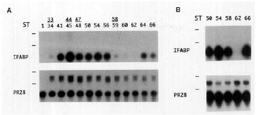 in the intestine (10 pg/lane except 1.5 ~g for limb); slight labeling in trunk is likely to be due to intestinal contamination. (B) IFABP mRNA is