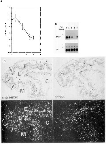 antisense 80S-labeled ri'ooprobe (A, C) show IF ABP expression specifically in the intestinal epithelium (E), but not in tbe connective tissue {C) or