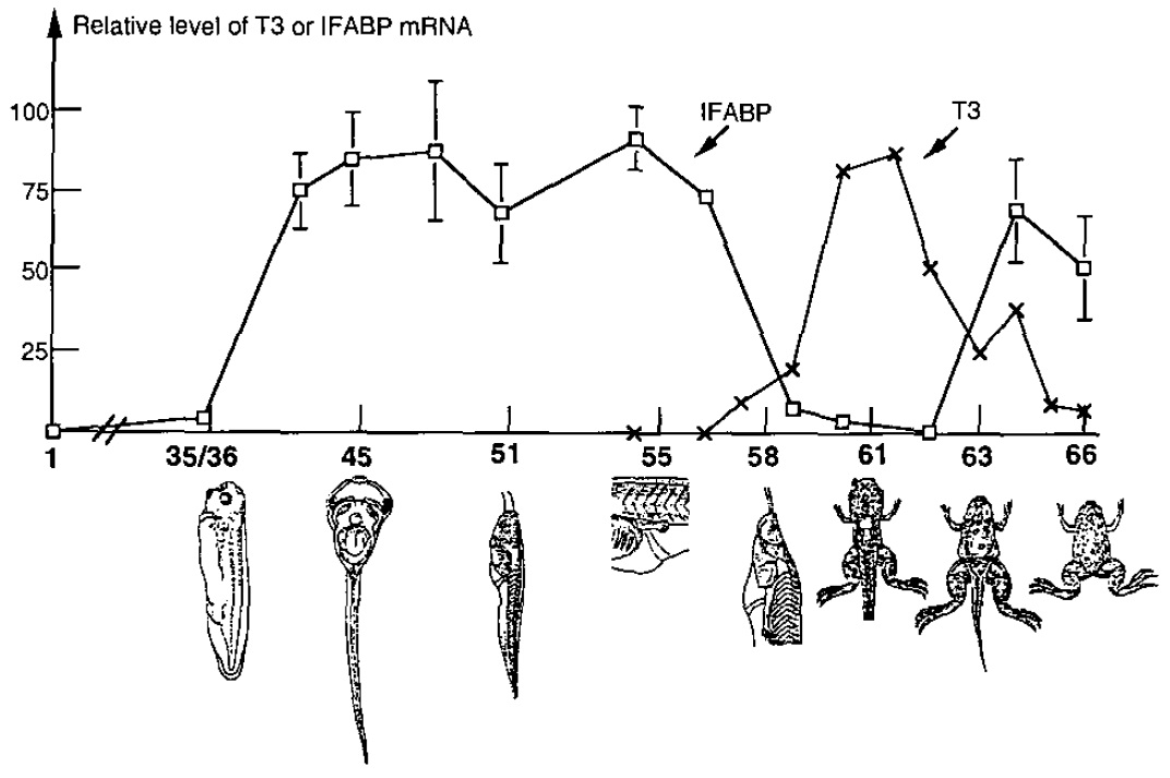 inversely correlated to falling levels of thyroid hormone after stage 62, our T, treatment experiments show that recovery of IFABP gene