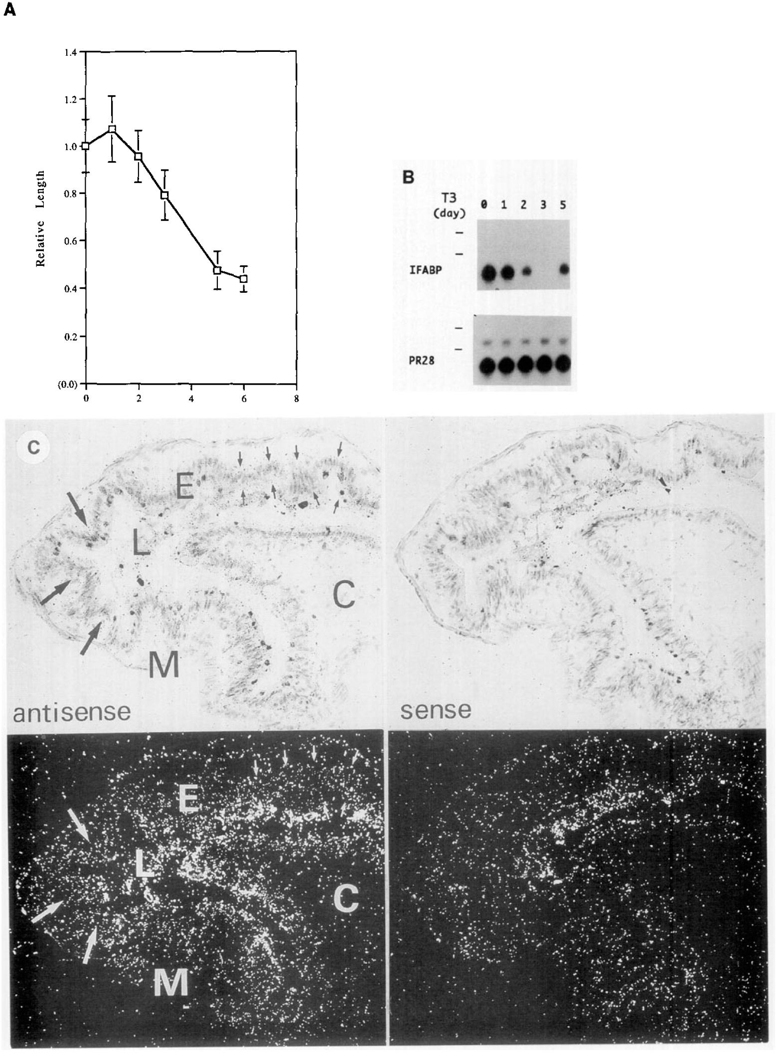 note that recovery of IFABP mRNA at Day 5 occurs despite high levels of thyroid hormone. (C) In situ hybridization of intestinal cross-sections