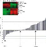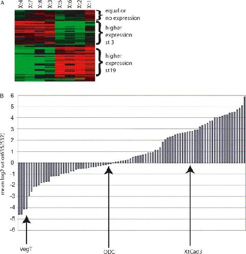 Fig. 1. A pilot microarray identifies genes whose expression changes during early X. tropicalis development. The microarrays were probed with labelled (Cy3 or Cy5) cDNA from st3 (4 cell) and stage 19 (neurula) X. tropicalis embryos. The hybridisations were carried out 4 times with one combination of dyes and 4 times with the dyes swapped, giving eight hybridisations in total. Each hybridisation is a biological replicate. The arrays were then scanned and the log2 ratio of fluorescence calculated for each oligonucleotide. (A) Cluster analysis of eight hybridisations using X. tropicalis material. Each column represents the result from 1 hybridisation, each bar the results from one gene. The greater the intensity of colour the greater the difference in ratio of the two wavelengths. Genes that appear black are not expressed or are evenly expressed in the two stages. Clusters of genes with higher expression at st3, st19 or equal expression can be identified. (B) The mean of the log2 ratio of the two wavelengths is plotted for each gene. The genes show a gradual transition from highly expressed at stage 3 to highly expressed in stage 19. The position of 3 well known Xenopus genes is marked.