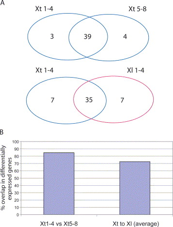 Fig. 5. Overlap in the results using X. laevis and X. tropicalis RNA. (A) The overlap between the differentially expressed genes identified using X. tropicalis RNA and those identified using X. laevis RNA. Differentially expressed genes were selected from each set of experiments (Xt1–4, Xt5–8 and Xl1–4) by having at least a 2 fold mean difference in expression between the two stages. The overlap in genes that were selected as differentially expressed in both Xt1–4 and Xt5–8 was calculated. This represents the overlap between the two sets of experiments. The overlap across species, between Xl1–4 and Xt1–4, was then calculated. (B) The percent overlap between the differentially expressed genes identified using X. tropicalis RNA (xt1–4 vs xt5–8) and those identified using X. laevis RNA (average Xl1–4 vs Xt1–4 and Xl1–4 vs Xt5–8). The majority of genes were identified using X. laevis or X. tropicalis RNA but using X. laevis material added an extra 12% difference compared with 2 sets of X. tropicalis experiments.
