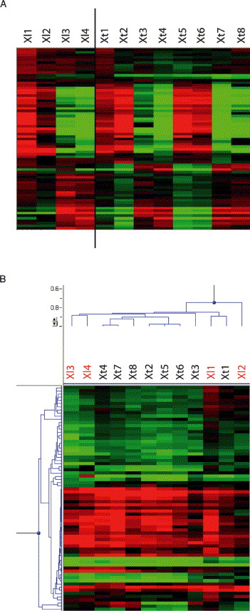 Fig. 2. The X. tropicalis oligonucleotide microarray also works using RNA from X. laevis. (A) Four X. laevis hybridisations are shown with eight X. tropicalis hybridisations for comparison. As with the X. tropicalis experiments each of the four X. laevis hybridisation is a biological replicate and dye swops were carried out giving 2 hybridisations with each combination of dyes. (B) Cluster analysis of the hybridisations from both species shows that the X. laevis hybridisations (marked in red) are often more similar to a X. tropicalis hybridisation than to another X. laevis hybridisation. For example X. laevis hybridisations 3 and 4 (Xl3-4) are most closely related to each other but are more similar to the X. tropicalis hybridisations (Xt 2–8) than the other two X. laevis hybridisations (Xl1 and 2).