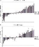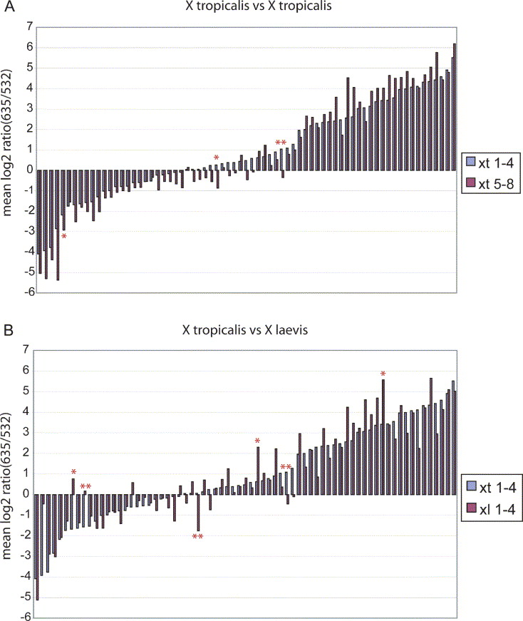 Fig. 3. Comparison of the results for each gene using X. laevis and X. tropicalis RNA. (A) The mean result for each gene is shown for two sets of 4 X. tropicalis experiments. (B) Shows the comparison of 4 X. laevis and 4 X. tropicalis experiments. The genes that are significantly different between the two sets are marked with ** (P<0.05) and * (P<0.1).