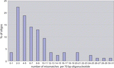 Fig. 4. The relationship between sequence mismatches and difference in result between species. (A) The number of mismatches between the 70 mer oligonucleotide designed to X. tropicalis sequence and the equivalent sequence in the X. laevis orthologue. The percent of the oligonucleotides is plotted against the number of mismatches.