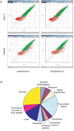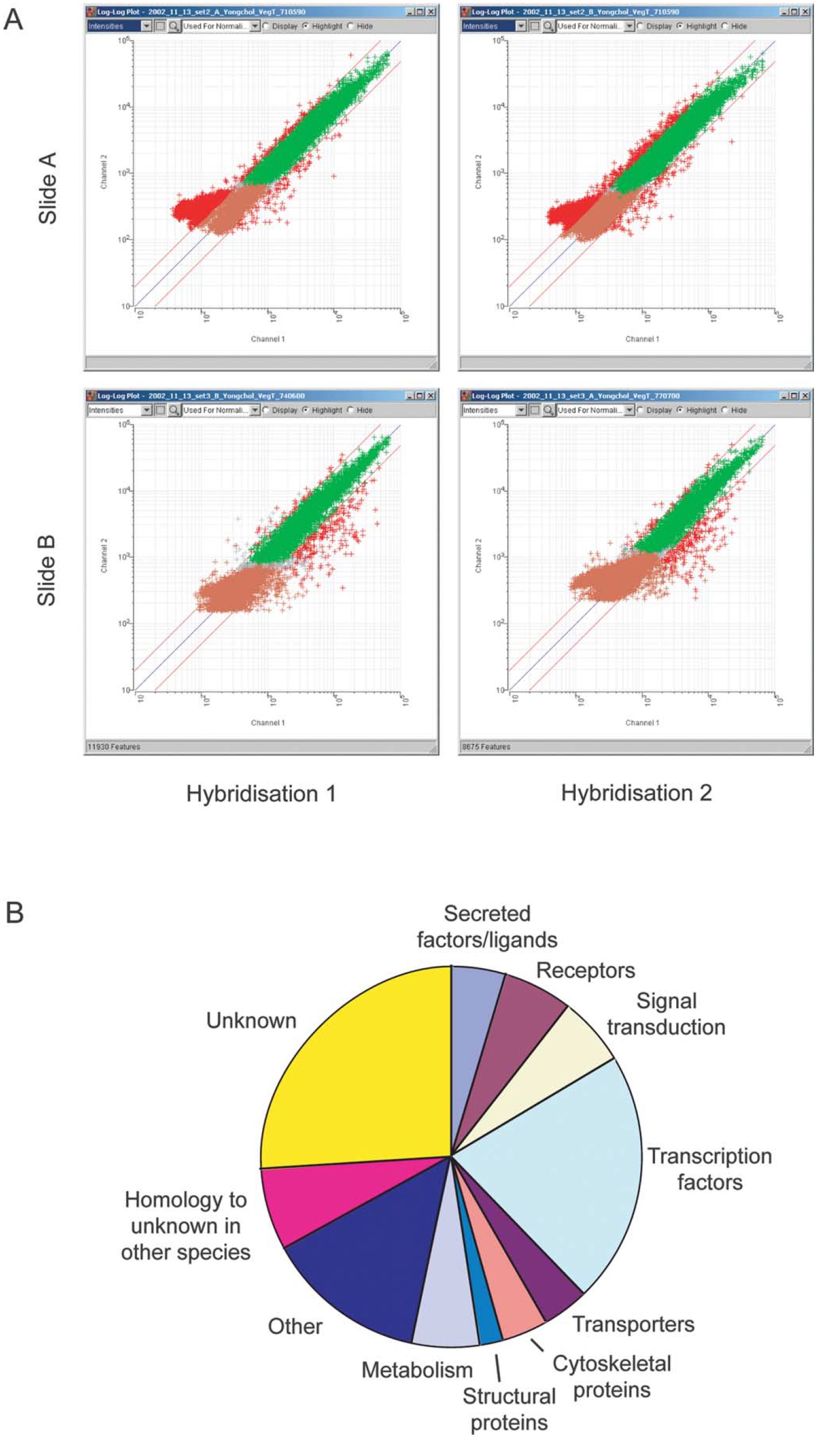 Fig. 2. Microarray analysis of VegT targets. (A) Scatter plots of Cy3 fluorescence (control animal caps; Y axis) against Cy5 fluorescence (dexamethasonetreated