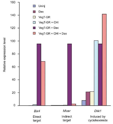 Fig. 4. Classification of VegT targets as ‘Direct’, ‘Indirect’, or ‘Induced by Cycloheximide’. Bix4 is classified as a direct target because it is activated by VegTGR