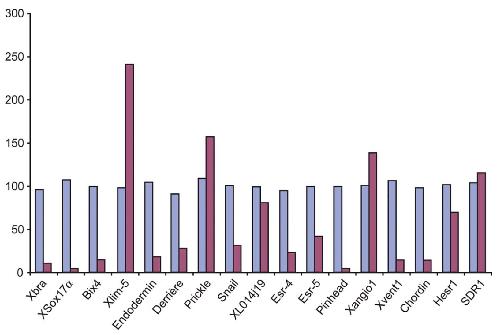 Xsox17a, Bix4 and Xlim-5 acting as positive controls; expression of the first three is known to be down-regulated in embryos lacking VegT, while expression of