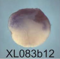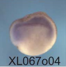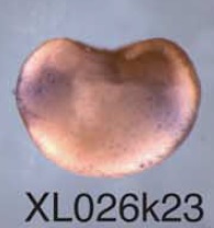 kif26a (kinesin family member 26A) gene expression in bissected Xenopus laevis embryo, assayed via in situ hybridization, NF stage 10, horizontal view, animal up, dorsal right.. |