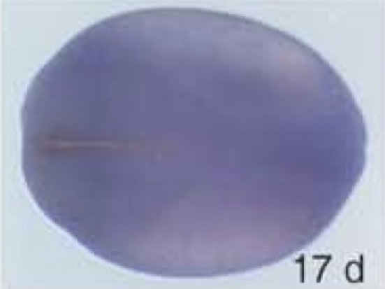 ccndx (cyclin Dx) gene expression in Xenopus tropicalis embryos, NF stage 11, as assayed by in situ hybridization. Anterior view: dorsal up. |