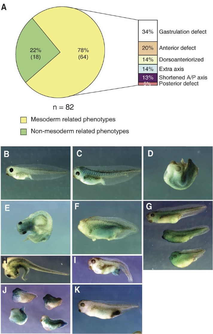 Fig. 3. Mesoderm related phenotypes. (A) Classification based on phenotype can be subdivided into two major groups: esoderm related phenotypes(gastrulation defect, anterior defect, dorsalanteriorized, extra axis, shortened A/P axis, and posterior defect), and on-mesoderm related phenotypes Values are given as percentages of numbers of identified active clones in the total (nZ82) and within the subgroup of mesoderm defect clones (nZ64). (B) Uninjected control at stage 34. (C) Control embryo injected with LacZ mRNA only and stained with X-gal. Lateral (D) and dorsal (E) view of gastrulation defect caused by injecting TGas002g05 (hypothetical protein LOC233805). (F) Embryo injected with clone TGas131g15 (Msx-1) displays anterior defect. (G) Injection with TGas059j09 (hairy2a), showing different degrees of a dorso-anteriorized phenotype. (H and I) Induced extra axis at injected site by TNeu118f24 (Lyn tyrosine kinase) and TGas127o03 (Otx5), respectively. (J) Embryos displaying shortened anteriorosterior axis following injection of TGas088n14 (similar to rat PKC-binding enigma). (K) Clone TNeu008i12 (Tbx6) gives rise to a posterior defect. |