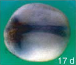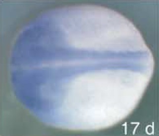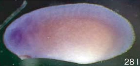 Fig. 11. Regionalized expression pattern of clones giving rise to shortened anteriorosterior axis. Seven clones from this synphenotype group gave rise to restricted expression patterns. The images are ordered by clone name. For each clone the species and annotation of the closest matching blastx hit is shown. Abbreviations are: a, anterior view (stage 17); d, dorsal view (stage 17); l, lateral view (stage 11, 28 and 30); v, vegetal view (stage 11). |