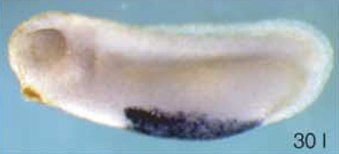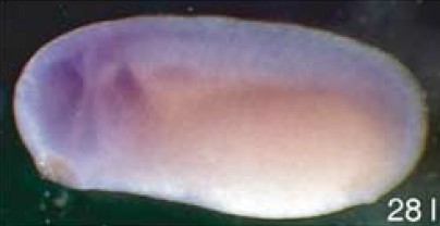ovol2 (ovo-like 2) gene expression in Xenopus tropicalis embryos, NF stage 11, as assayed by in situ hybridization. Lateral view. |