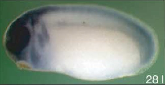 ovol2 (ovo-like 2) gene expression in Xenopus tropicalis embryos, NF stage 28, as assayed by in situ hybridization. Lateral view: anterior left, dorsal up.