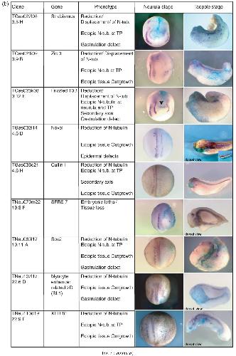 Fig. 4. (a,b) Expression patterns of the single clones identified in the unique full-length set screen. Xenopus tropicalis gastrula, neurula and tailbud stage