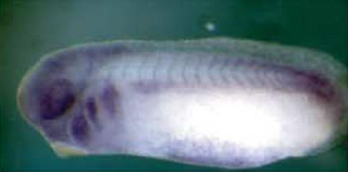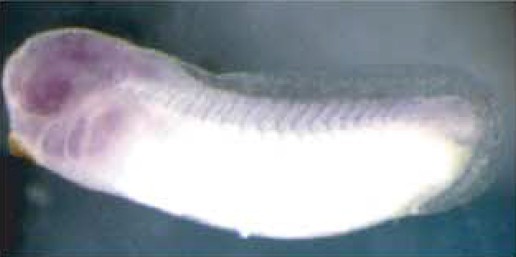 stk17a (serine/threonine kinase 17a) gene expression in Xenopus tropicalis embryos, NF stage 28, as assayed by in situ hybridization. Lateral view: anterior left, dorsal up. |