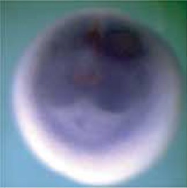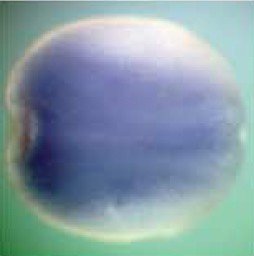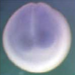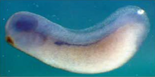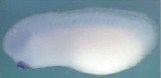 beta-galactosidase RNA as a lineage tracer (light blue staining) were injected animally into one cell of two cell stage Xenopus laevis embryo. Embryos were