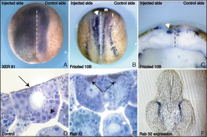Fig. 5. Additional detail on the overexpression of 4 selected genes and Rab32 expression. (a) XER 81 RNA injections expand X-Sox3 (purple) on the injected side. (b+c) Frizzled10B RNA injections enhance the medial (motorneuron) stripe of N-tubulin expression (white arrowhead, in wholemount (B) and transverse (C) view), in addition to the ectopic expression of N-tubulin observed in the floorplate (shown in Fig. 4b). (dashed line-midline, l-lateral, i-intermediate, m-medial). (d+e) 1 μm sections of Rab32 (1 ng) injected (E) and control Xenopus laevis (D) embryos. (D) In wild type embryos the melanosomes (darkly pigmented vesicles, arrow) are localised predominantly under the apical surface, but some can be found deeper within the cells (arrowhead). In contrast, when Rab32 was overexpressed the melanosomes were clustered tightly together and localised under the apical surface (arrows). (f) Transverse section (30 μm) of a bleached Xenopus tropicalis tailbud embryo in situ hybridised with an antisense probe to Rab32. Rab 32 is expressed in the retinal pigment epithelium (purple). |